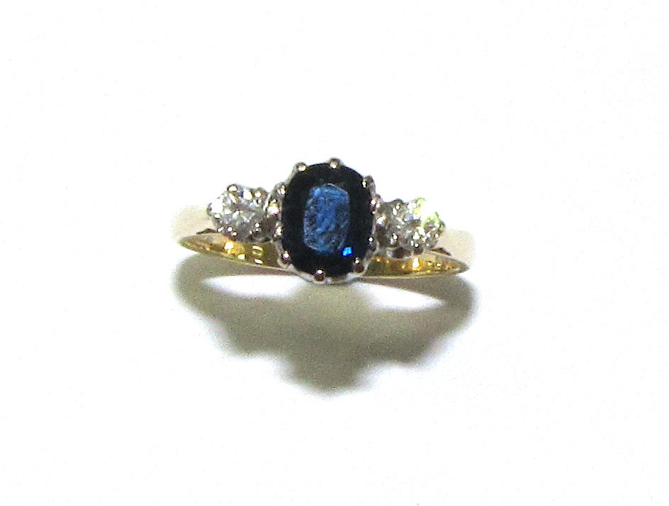 Pre-loved 2 x briliaint cut diamondsand a oval dark blue sapphire ring . Please contact us for full terms and conditions of sale for this item. £1,200.